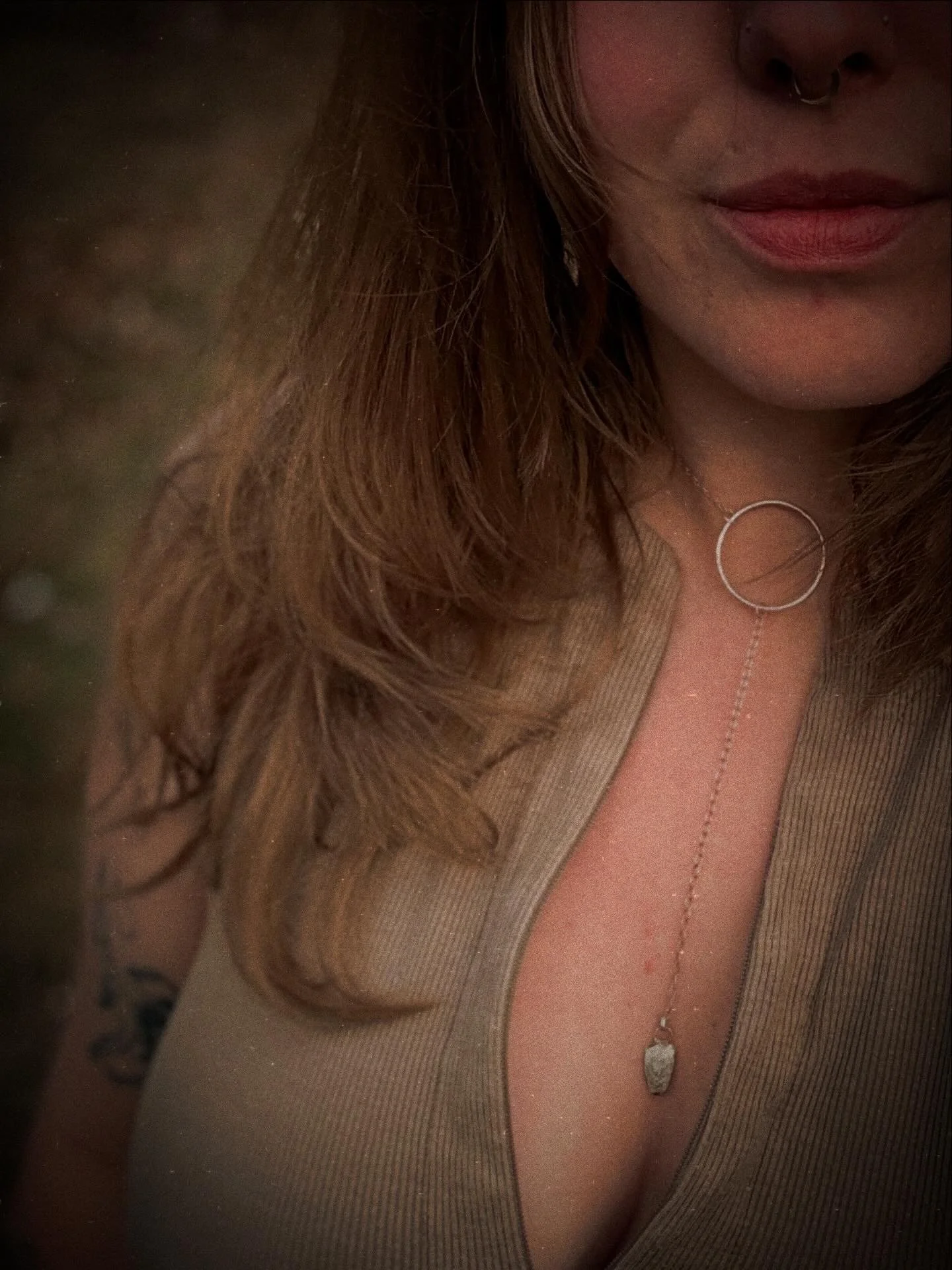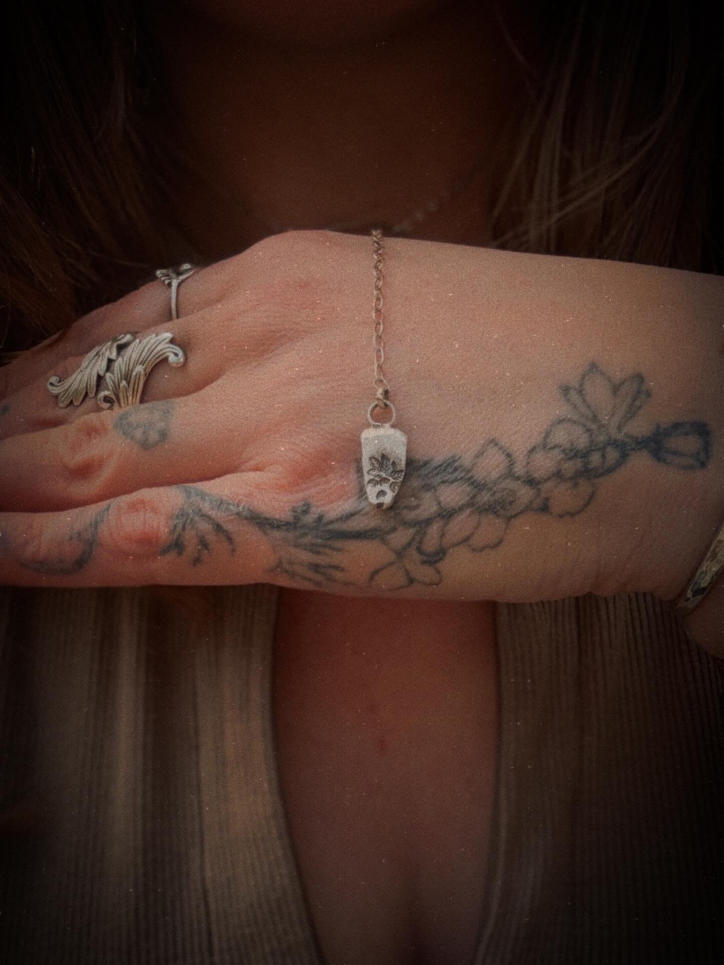 Sterling silver choker featuring a sterling hoop that suspends a fine silver totem, intentionally tarnished and adorned with a hammered leaflike sun embellishment.