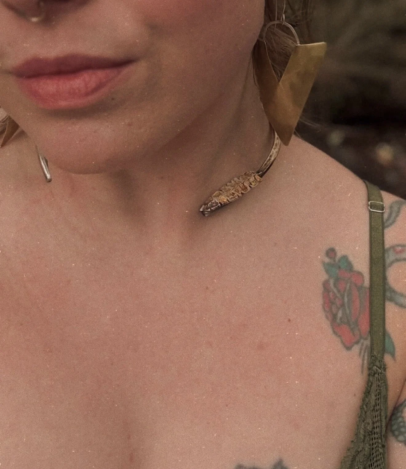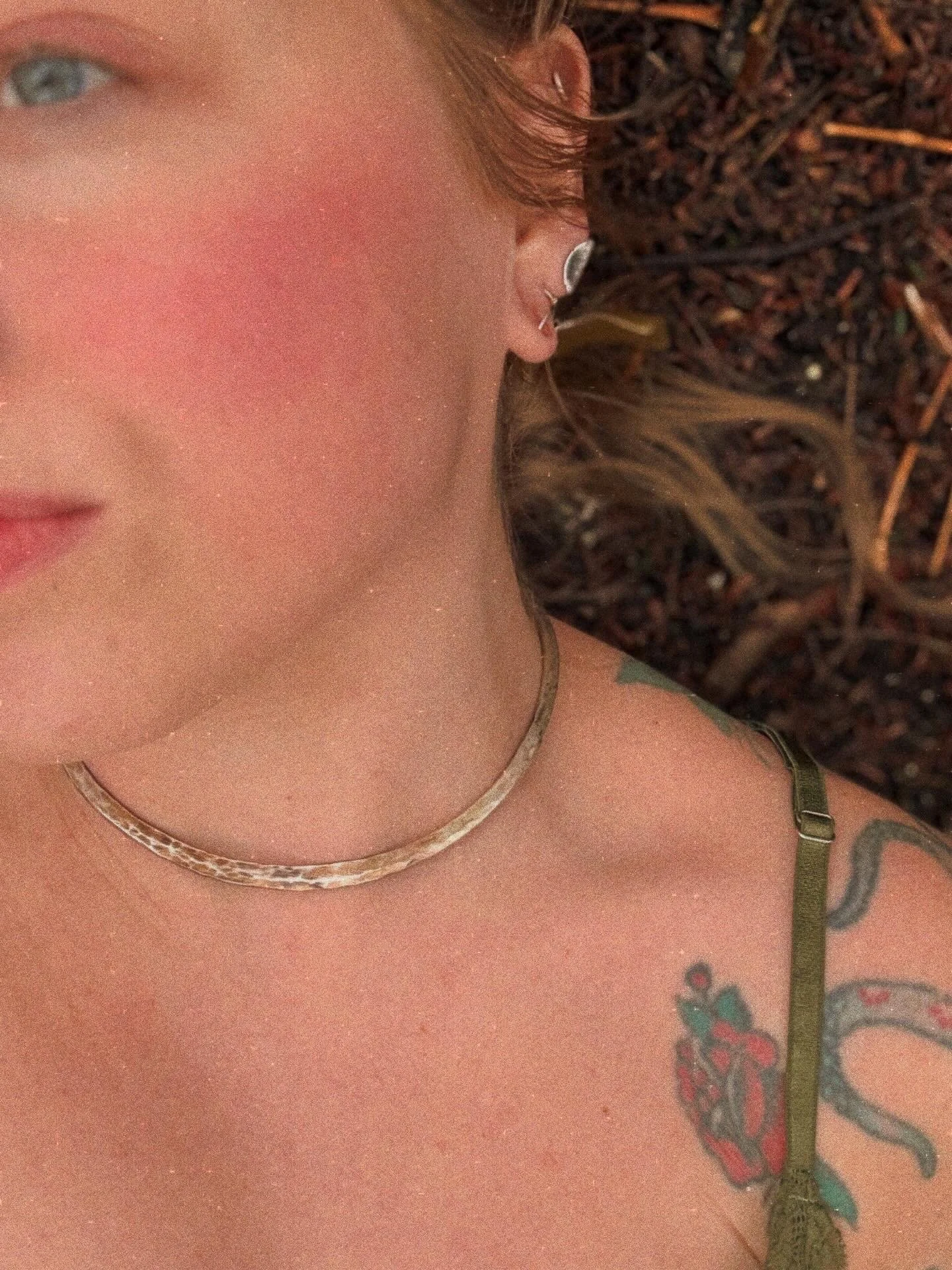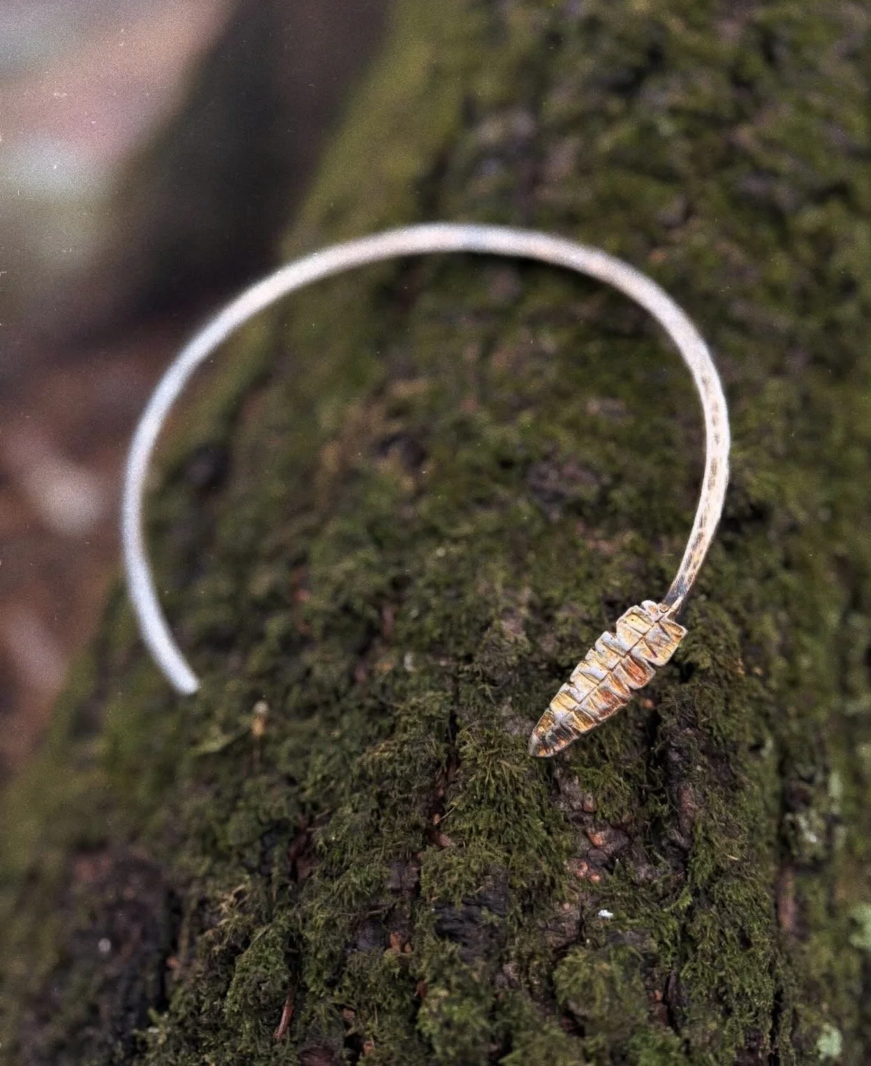 A bold, hammered, timeless sterling silver cuff necklace with a handcrafted fine silver fern, lightly tarnished.