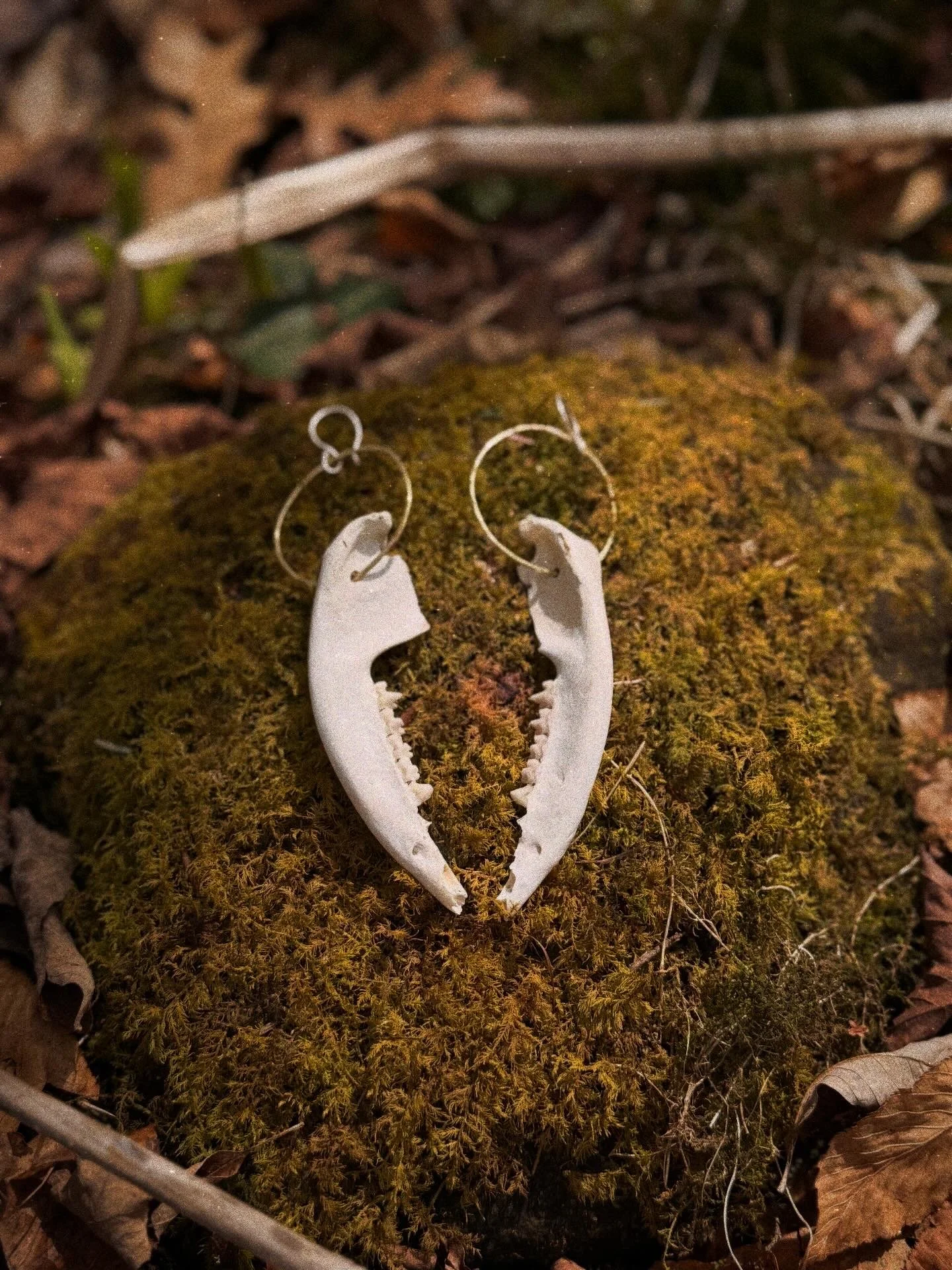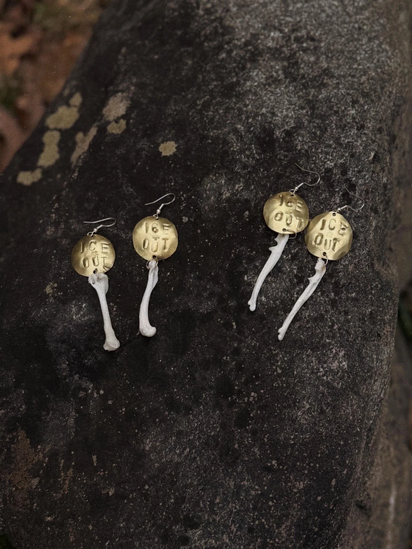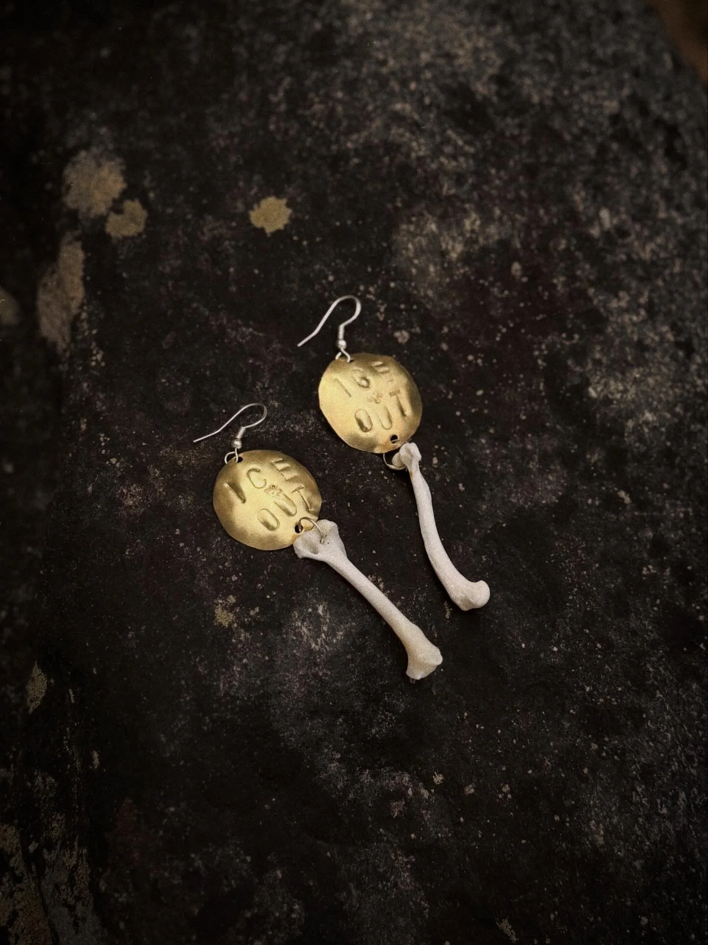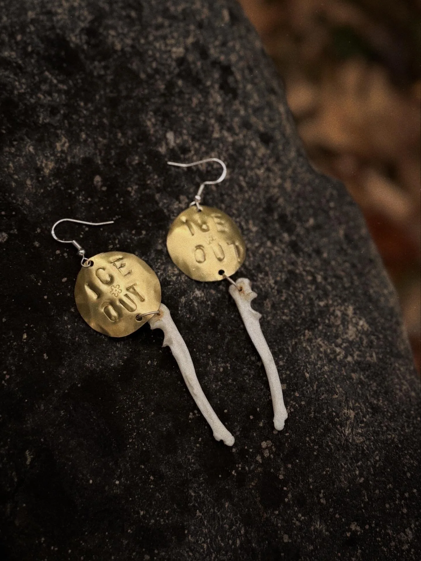 Stamped brass earrings with dangling, ethically sourced fox bones, suspended from sterling silver hooks.