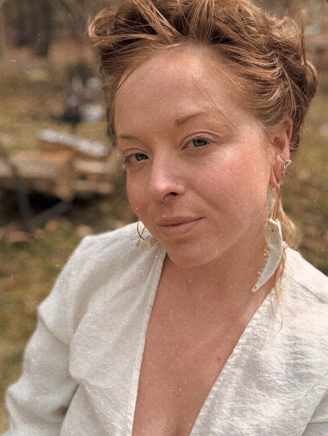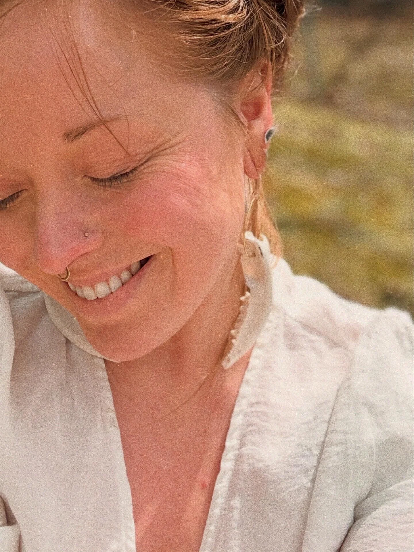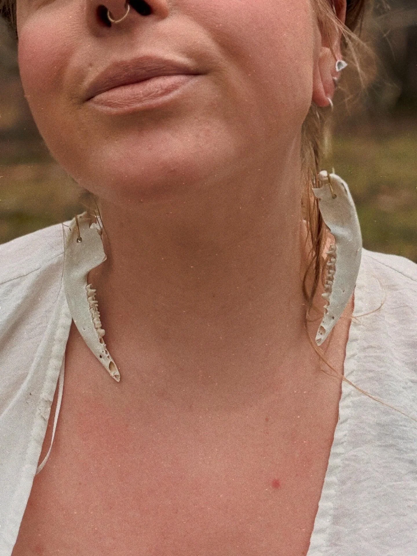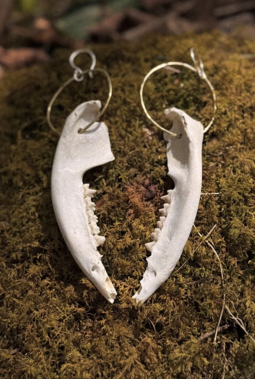 Stamped brass earrings with dangling, ethically sourced fox bones, suspended from sterling silver hooks.