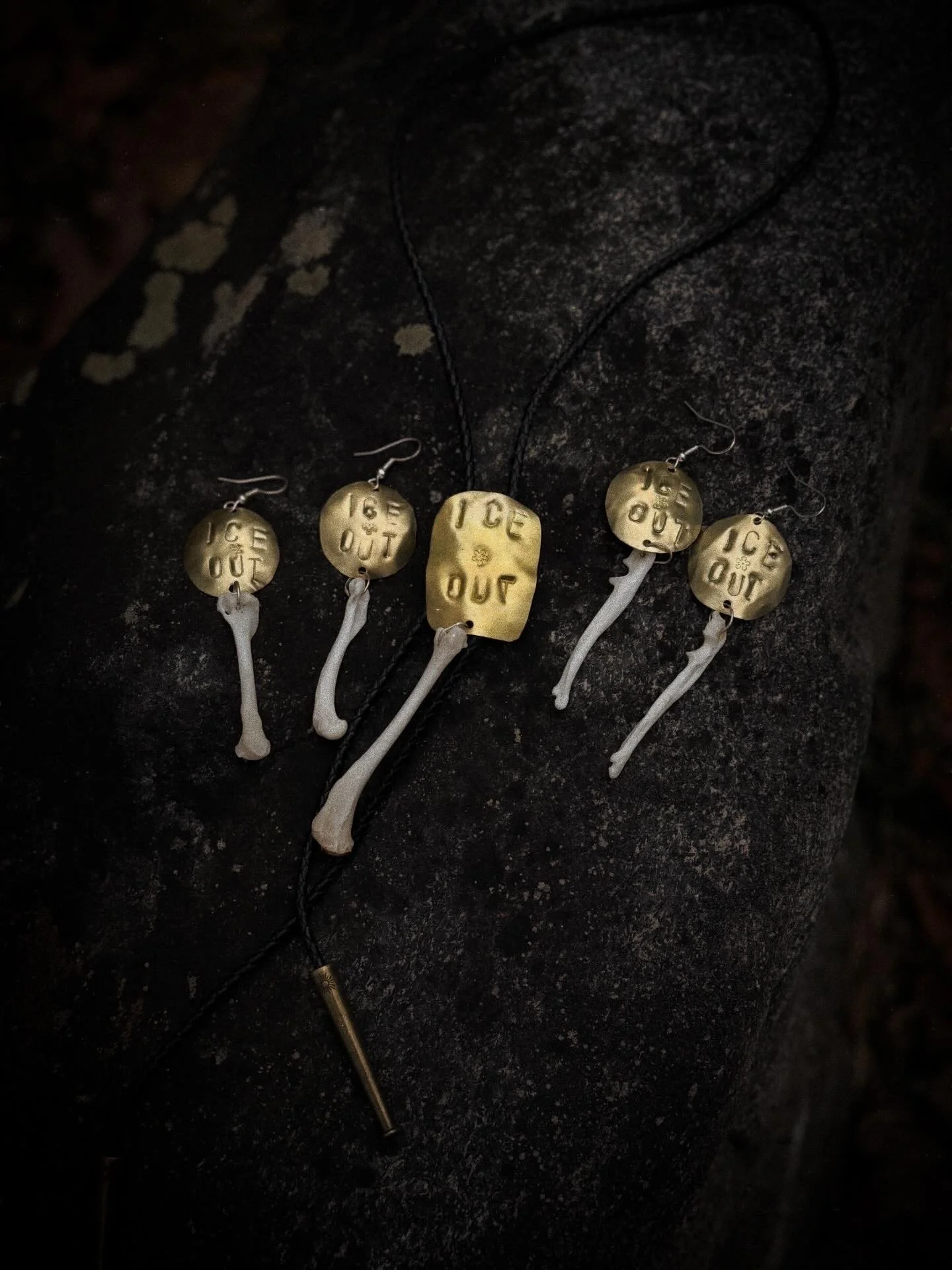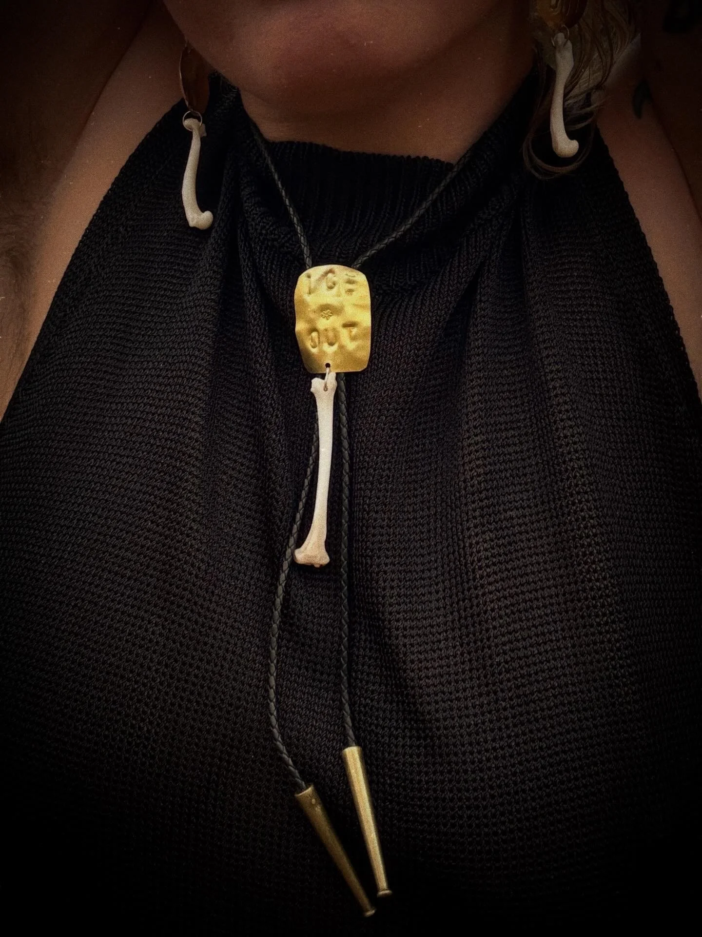 Bolo tie featuring a genuine leather cord, a stamped brass plate, and a single dangling fox bone, finished with brass tips stamped with a sun motif.