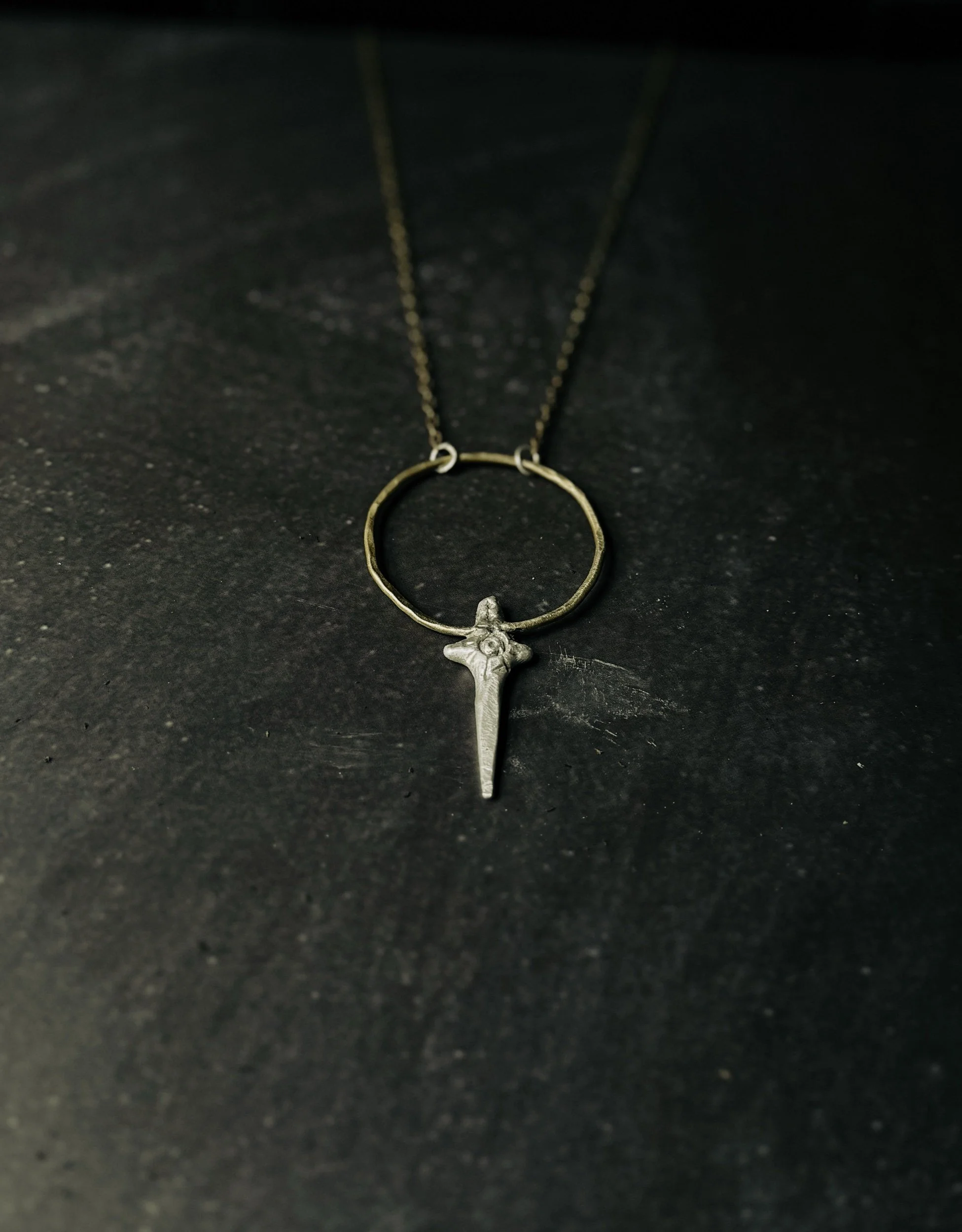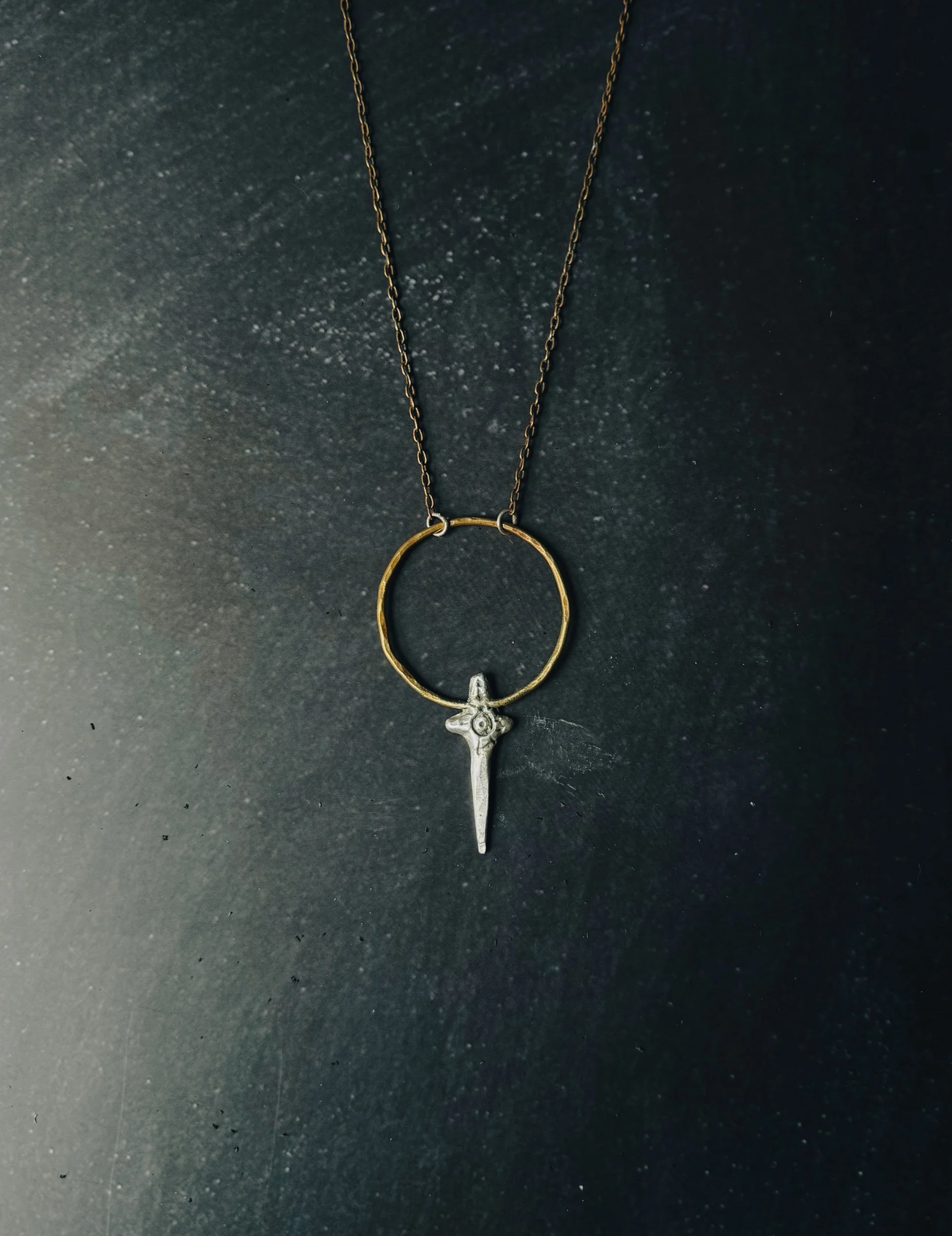A handcrafted, fine silver sword hugged by a hammered brass ring and suspending from raw brass chain with sterling silver hooks. Around 24” long.