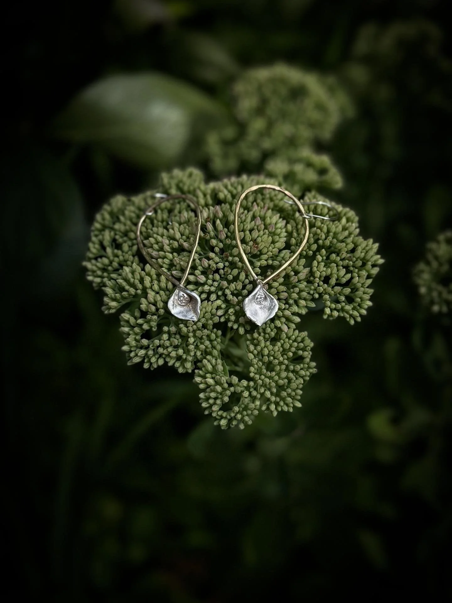 Fine silver calla Lilly’s with hammered brass teardrops and handcrafted sterling silver hooks.