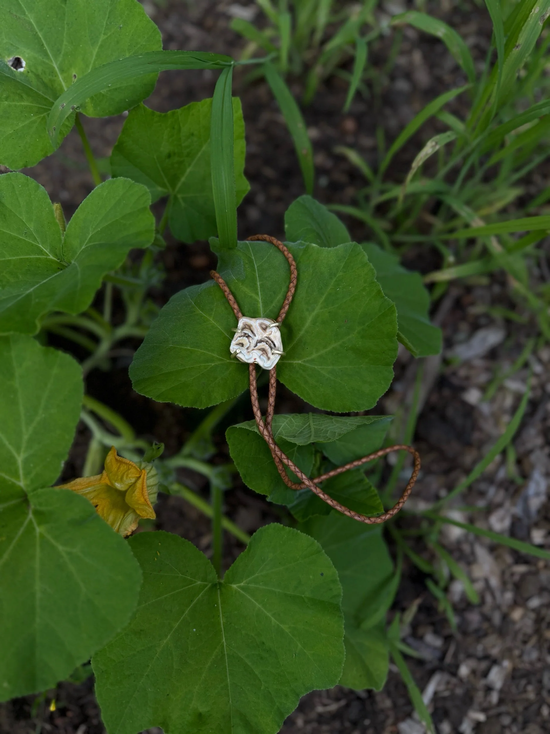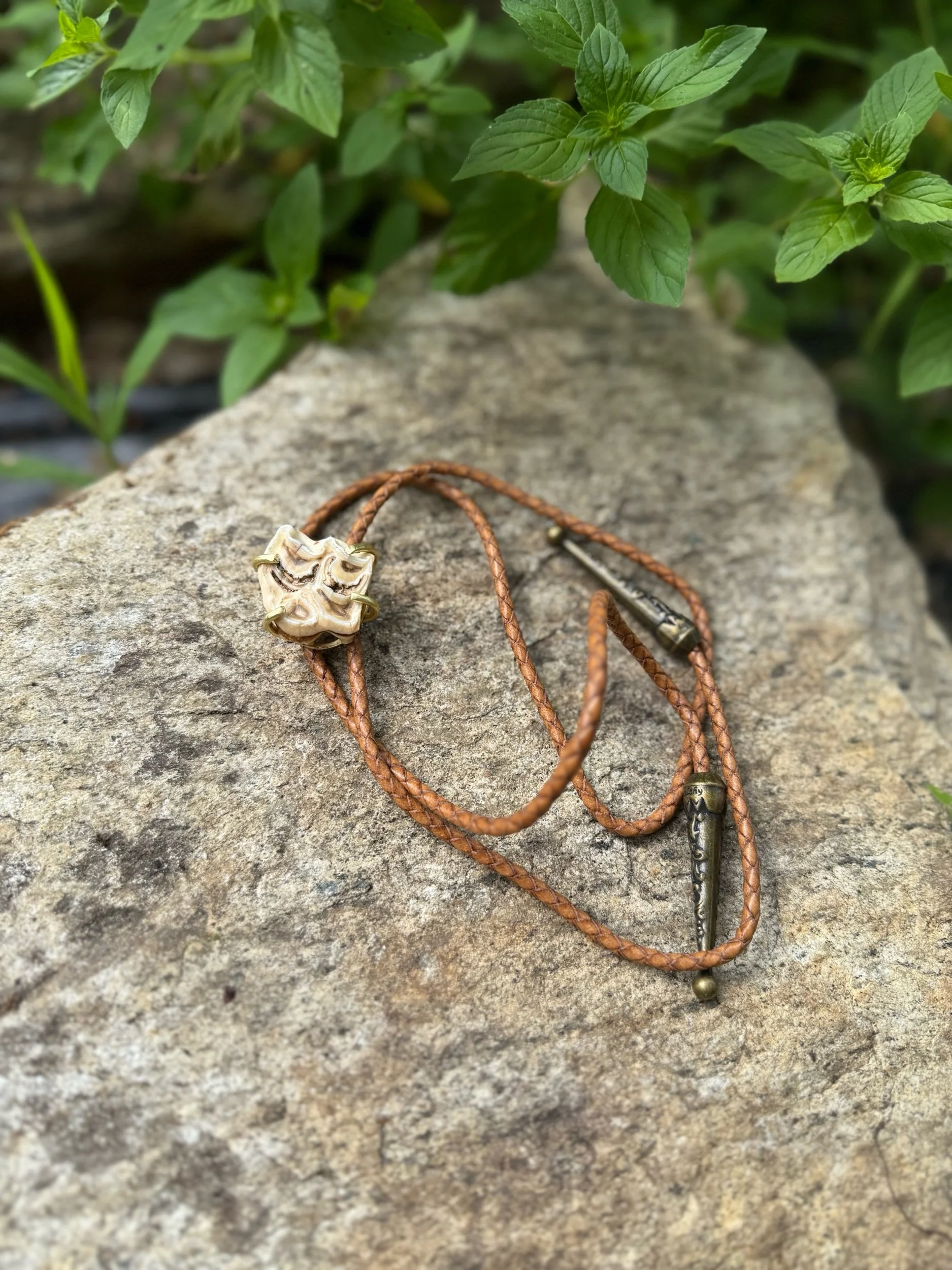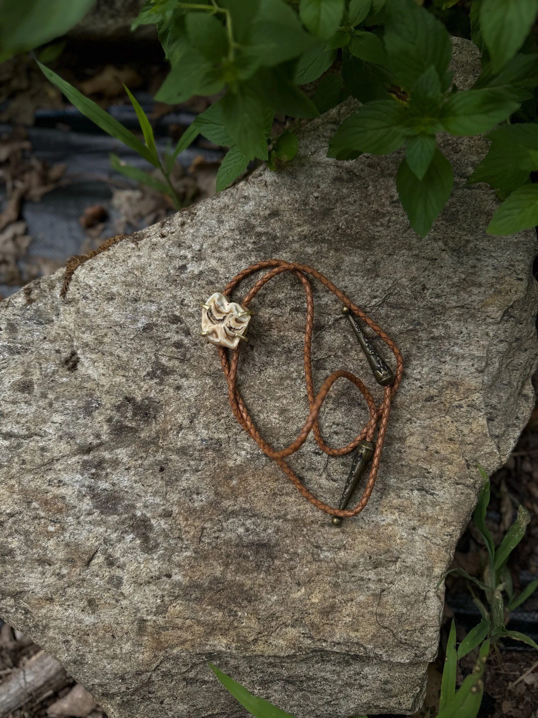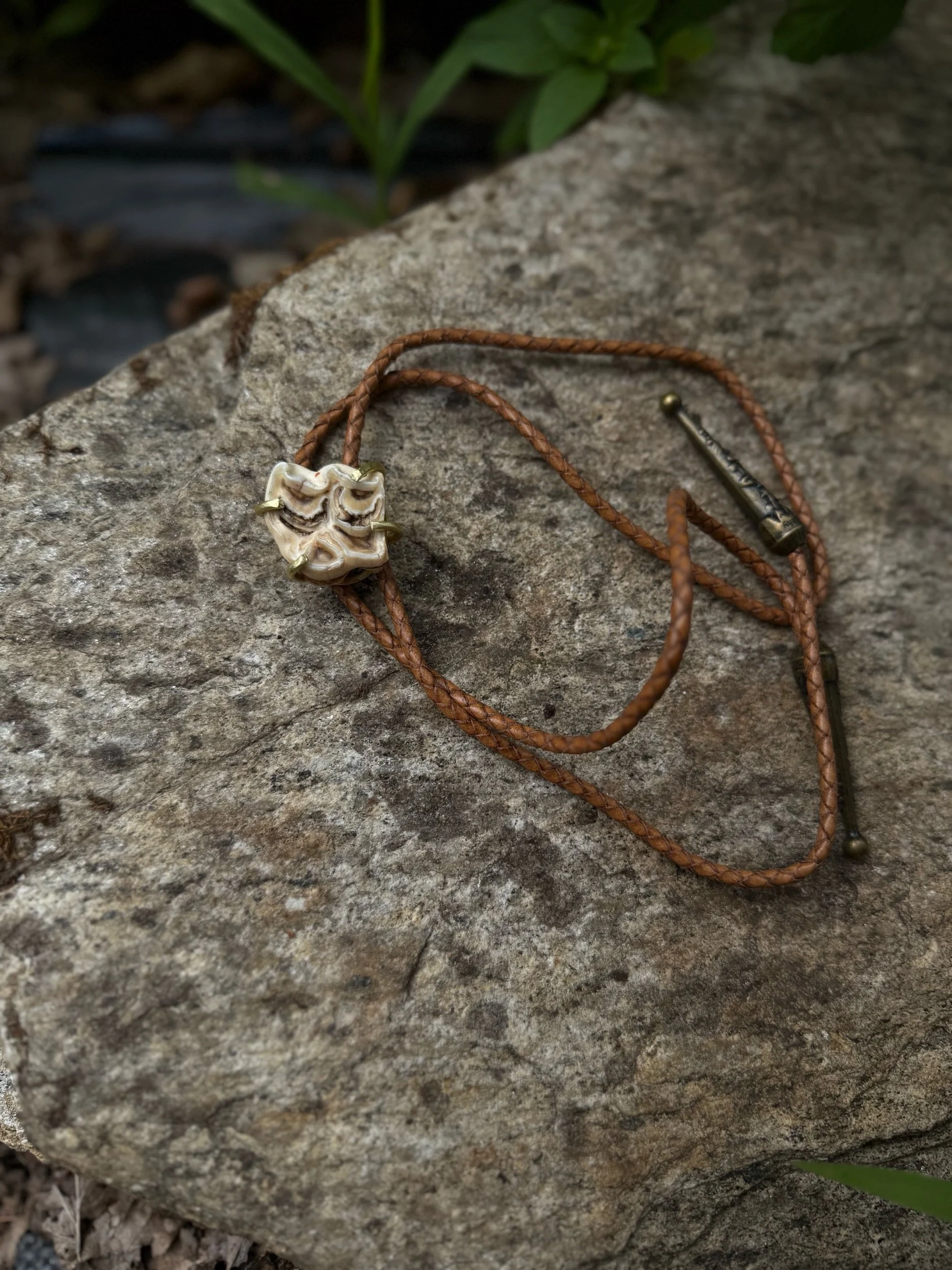 From my step sister’s horse from years ago, this horse tooth is hugged by hammered brass and hugs a genuine leather cord with mixed metal tips.