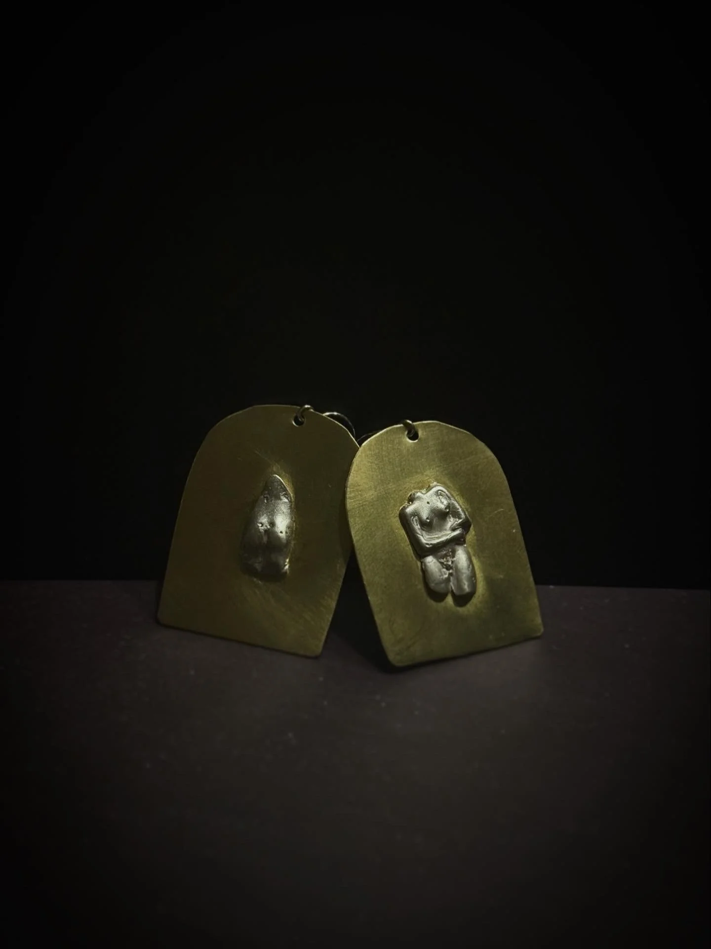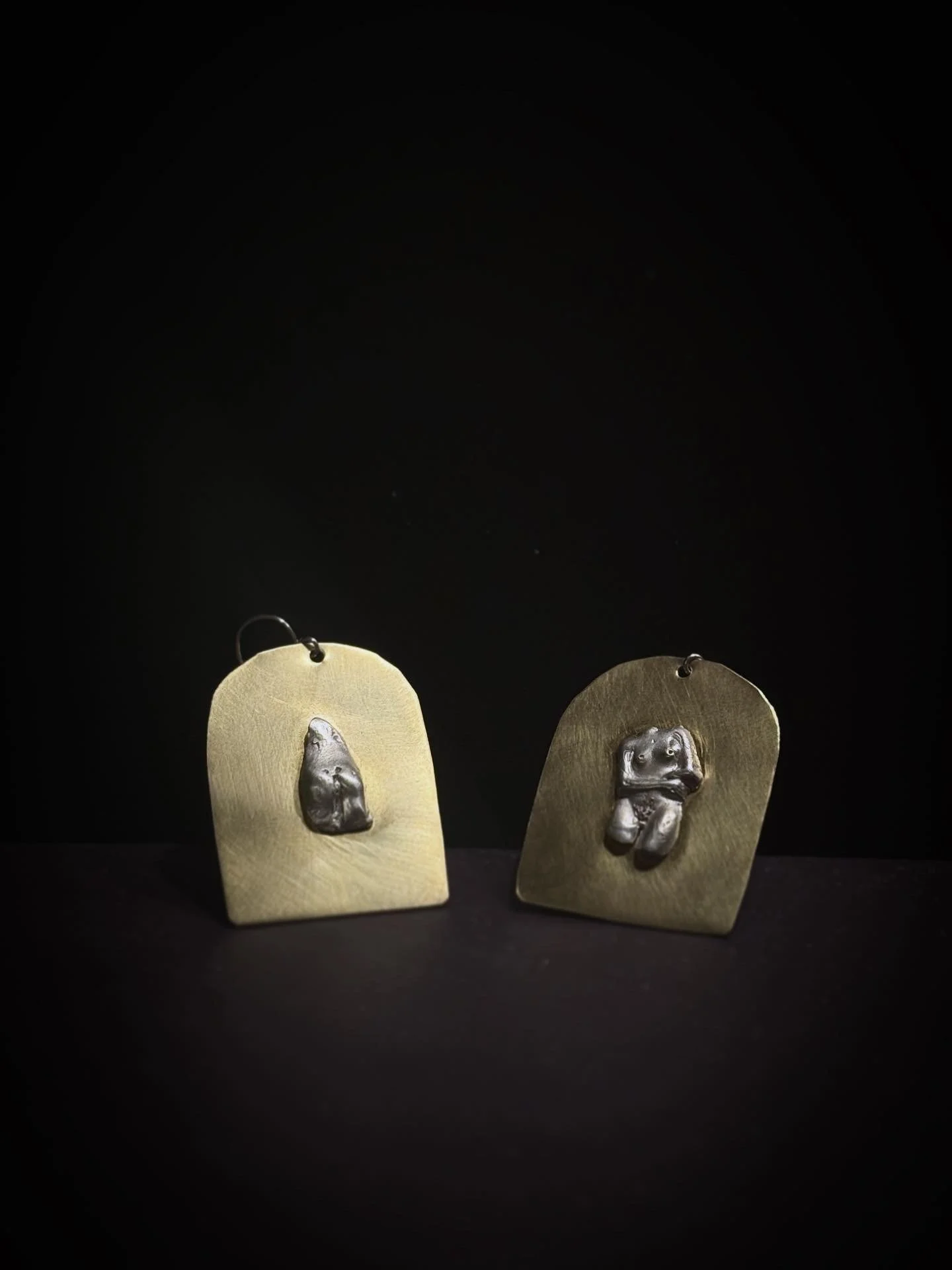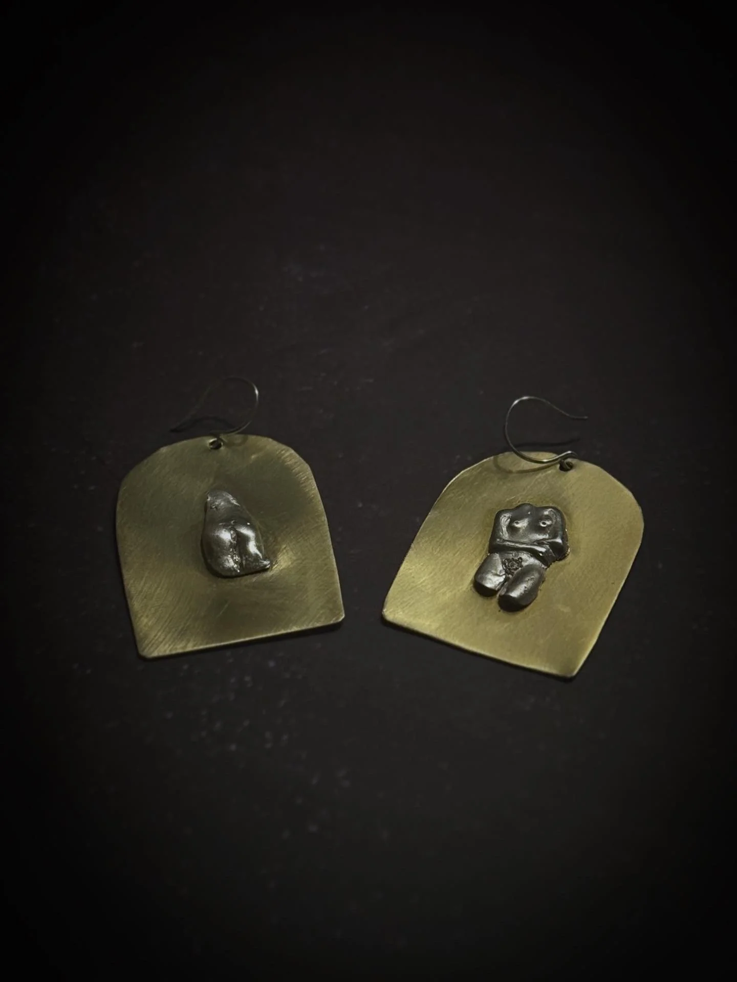Hand-sculpted silver bodies rest upon warm yellow brass, finished with sterling silver hooks.