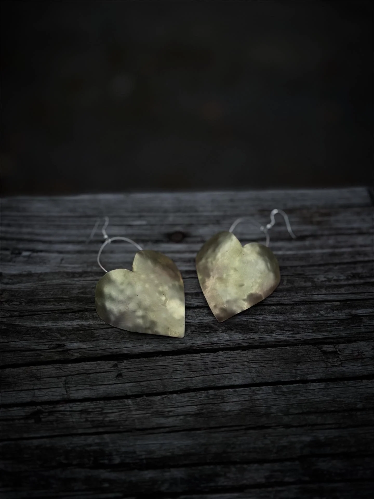 Hammered brass hearts with soldered sterling silver accents and sterling silver hooks. Bold and lightweight.