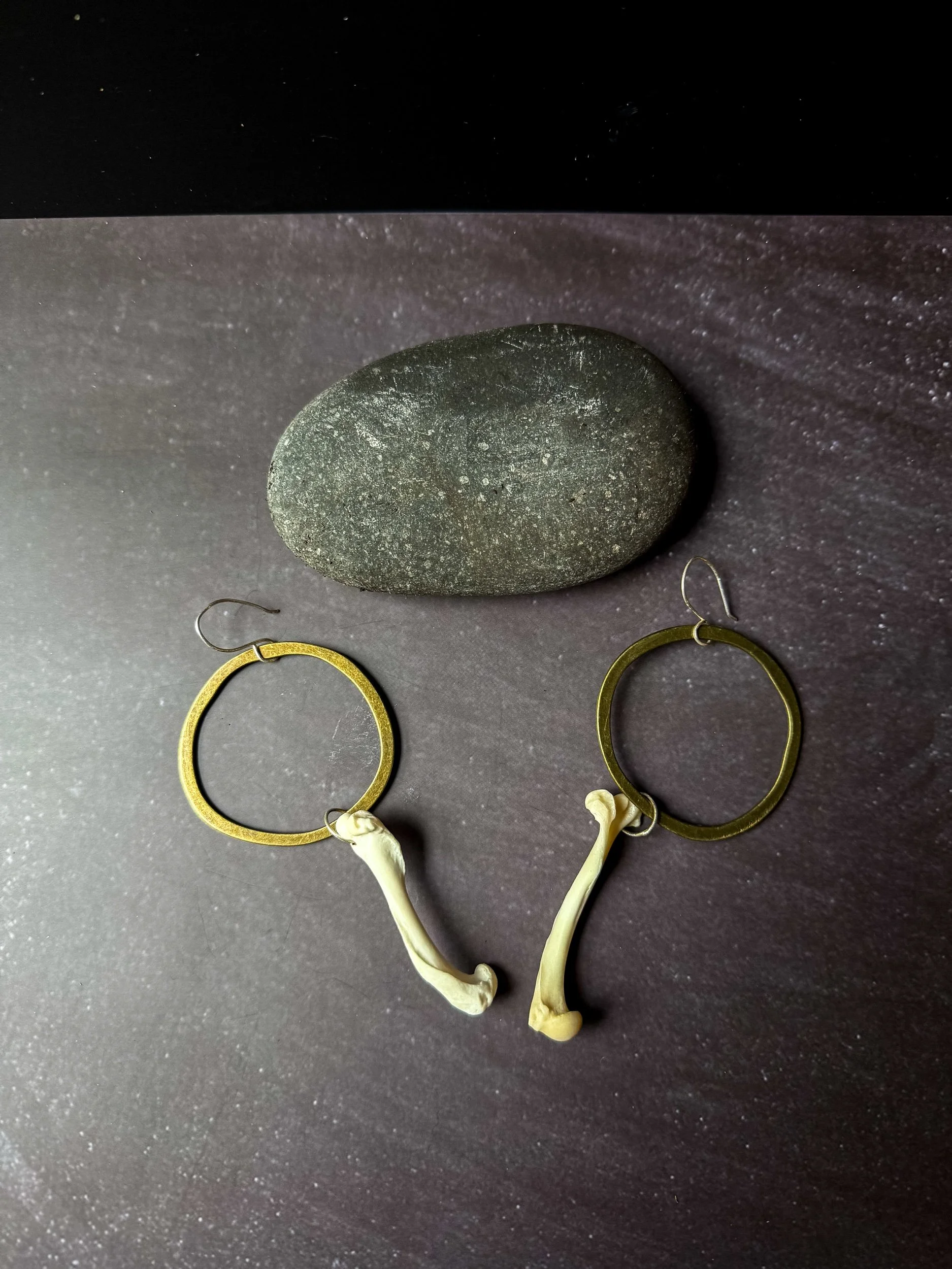 Ethically sourced coyote bones dangle from a single silver rings, suspended within thick brass circles. Finished with sterling silver hooks.