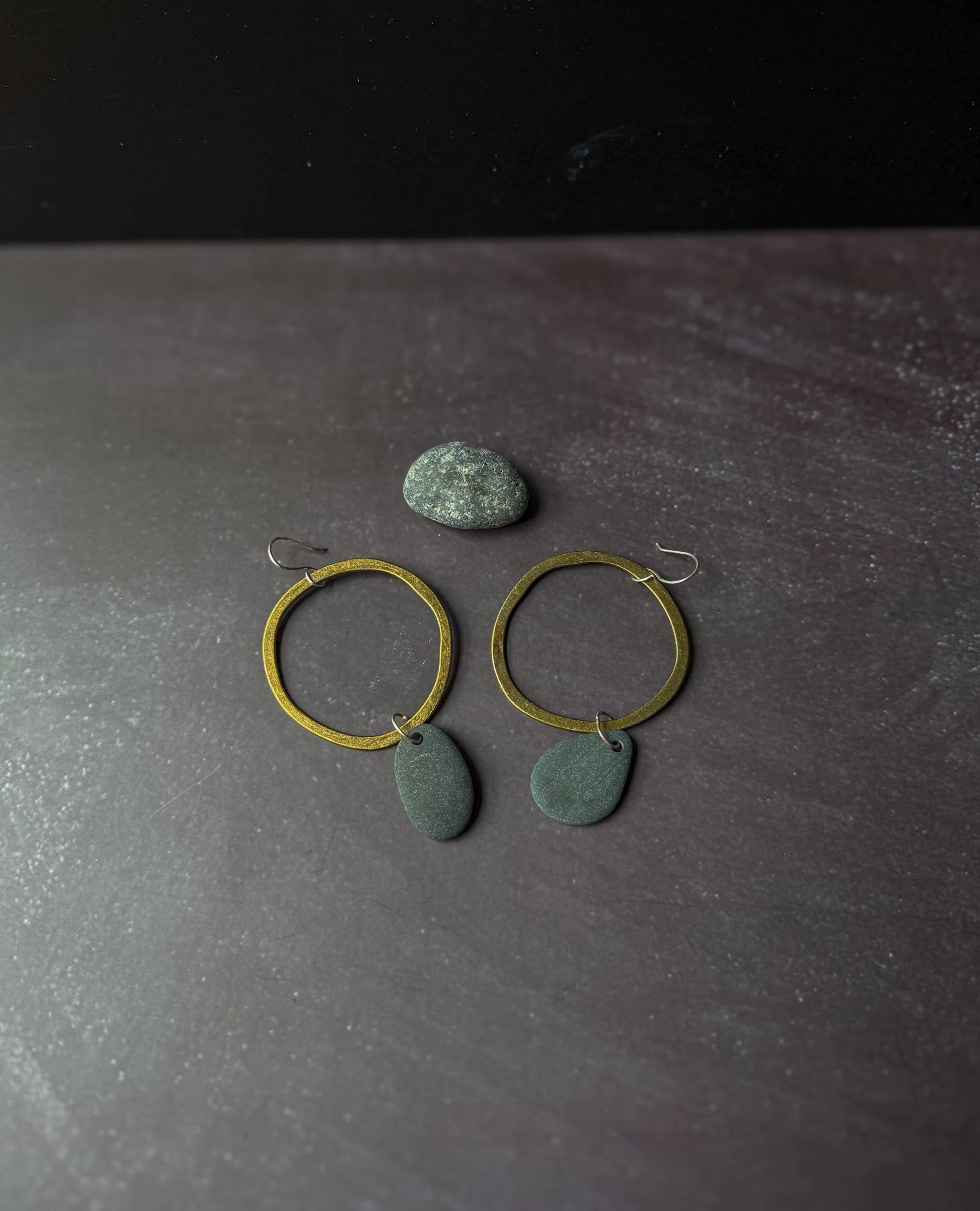 Drilled beach stones hanging on sterling silver and suspending from thick, brass hoops with handcrafted sterling silver hooks.